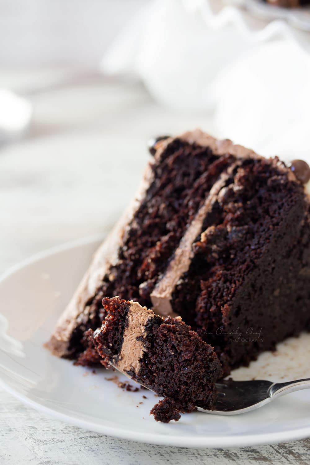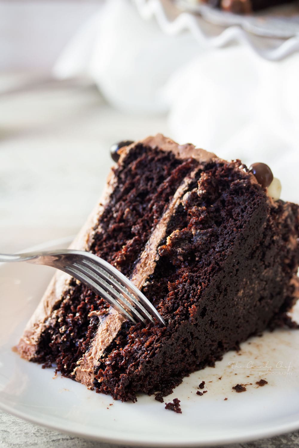 This cake would pair well with just about any frosting you’d like! For a fun boozy twist, try my Bailey’s buttercream! I went with a light and airy chocolate buttercream, as I thought the cake was already so decadent, and didn’t want to over-do it on the richness factor.