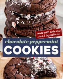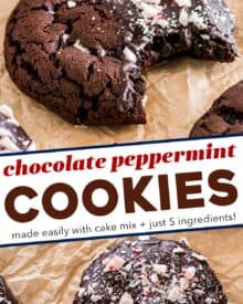 These chocolate peppermint cookies are made with cake mix, studded with crushed peppermint candies, then dipped in melted chocolate and more peppermint. Easy dessert recipes like this are perfect for your holiday gatherings/cookie exchanges, but could use a baking shortcut!