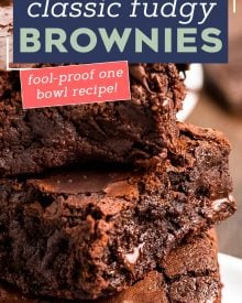 These Classic Fudgy Brownies are made with BOTH cocoa powder and chocolate. Made right in the saucepan, you won’t believe how easy it is to make brownies from scratch with dense fudgy centers and shiny, crackly tops!