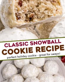 Snowball cookies are a classic holiday dessert made with simple ingredients, are buttery, nutty, and just melt in your mouth. Perfect for Christmas, or any other holiday, they’ll be a family favorite on the dessert tray!