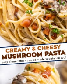 Creamy mushroom pasta is loaded with golden brown seared mushrooms and everything is smothered in a silky and oh so creamy garlic parmesan sauce. With two simple swaps it can be made vegetarian, and while it’s really easy to make, it looks (and tastes) fancy enough for a special occasion dinner!
