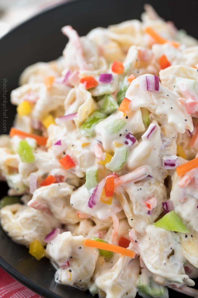 Step aside from traditional pasta salad recipes and give this creamy tortellini salad a try! ย It’s very similar to what we in the Midwest call macaroni salad, with a sweet and tangy dressing… but this rainbow version is full of brightly colored vegetables and is made using cheese-filled tortellini instead of elbow pasta. ย Trust me, make this for your next cookout or summer bbq and everyone will be asking for the recipe!!