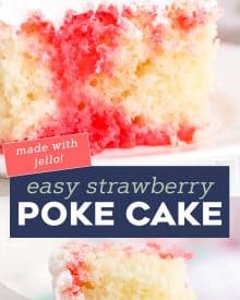 This Strawberry Poke Cake is the easiest and most delicious summer dessert around! Fluffy white cake is infused with strawberry jello, then slathered with whipped cream! Naturally a make ahead dessert, this is a dessert recipe the whole family will love!