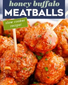 This is the best meatball recipe ever! I love the combination of honey and buffalo sauce, and making this with frozen meatballs makes it so easy.
