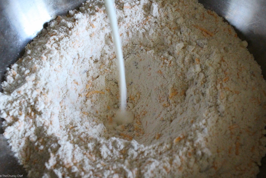 - Transfer to bowl and add liquid. Make a little well in the center and pour in cold buttermilk.