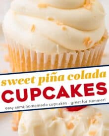 These piña colada cupcakes are the perfect blend of fluffy, soft, and moist. Topped with a swirl of vanilla buttercream frosting, and garnished with pineapple and a maraschino cherry, they taste like a sweet and coconut-y piña colada cocktail, and are perfect for Spring and Summer!