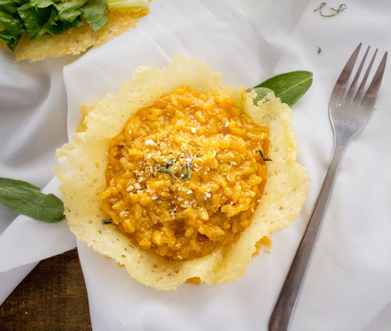 I’ve made Parmesan bowls before, but only to serve salad in. What a great idea to use them for a risotto, particularly a pumpkin one!