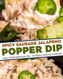 This easy game day appetizer combines the flavors of jalapeño poppers and spicy sausage in a creamy dip made in the slow cooker or oven. Perfect for any party, serve it up with chips and watch everyone go back for seconds!