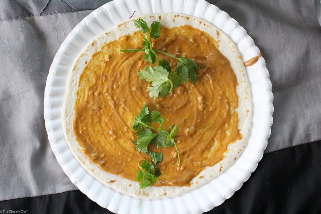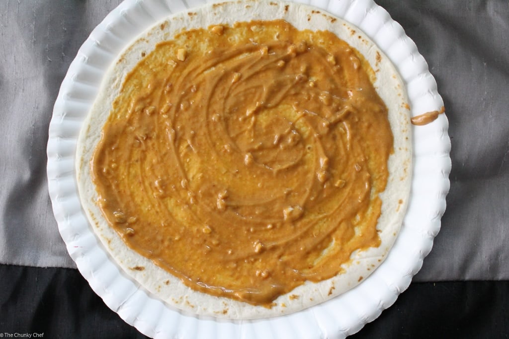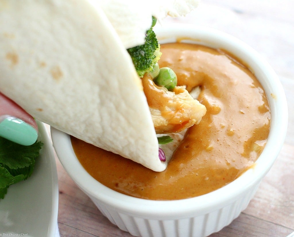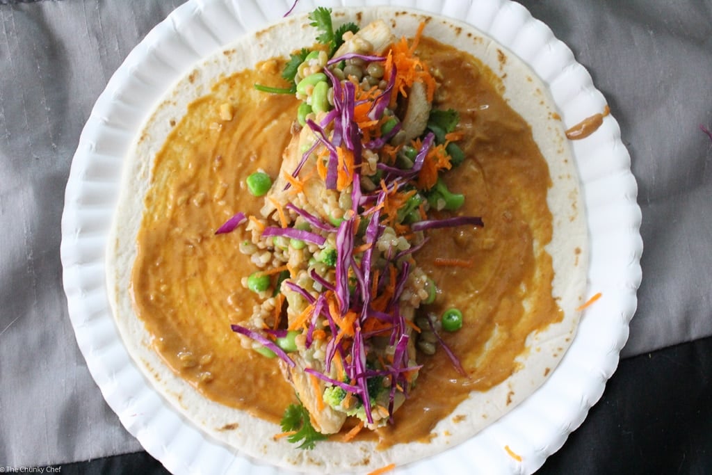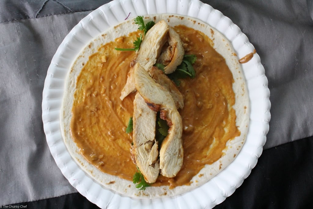 You could heat these up and serve them as is… they’re delicious all on their own! But you know how I love my food flavor packed, so I combined the two and made a spicy Thai peanut chicken wrap with a quick and easy Thai peanut sauce 🙂