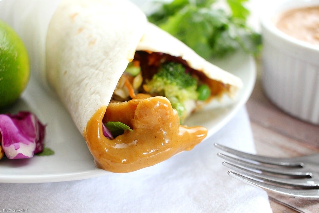 These quick and easy chicken wraps are loaded with great flavors! Just 6 easy ingredients plus a homemade Thai peanut sauce, and you’re good to go!