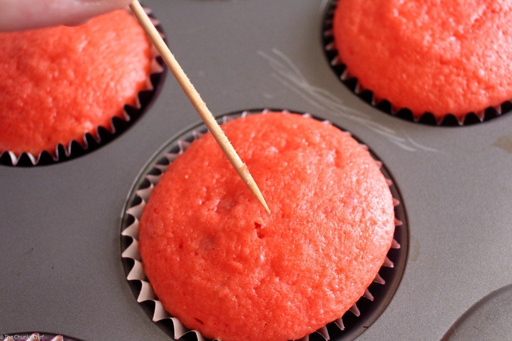 - Prepare muffin tin by lining with cupcake liners. Fill liners about 2/3 of the way full and bake, according to package directions, or until a toothpick inserted in the cupcake comes out clean.
