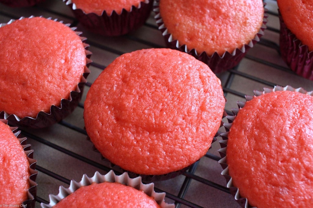 Bake, following the cupcake directions on the box until a toothpick inserted in the center comes out clean. Cool completely on cooling racks. Look at that beautiful pink color!!!