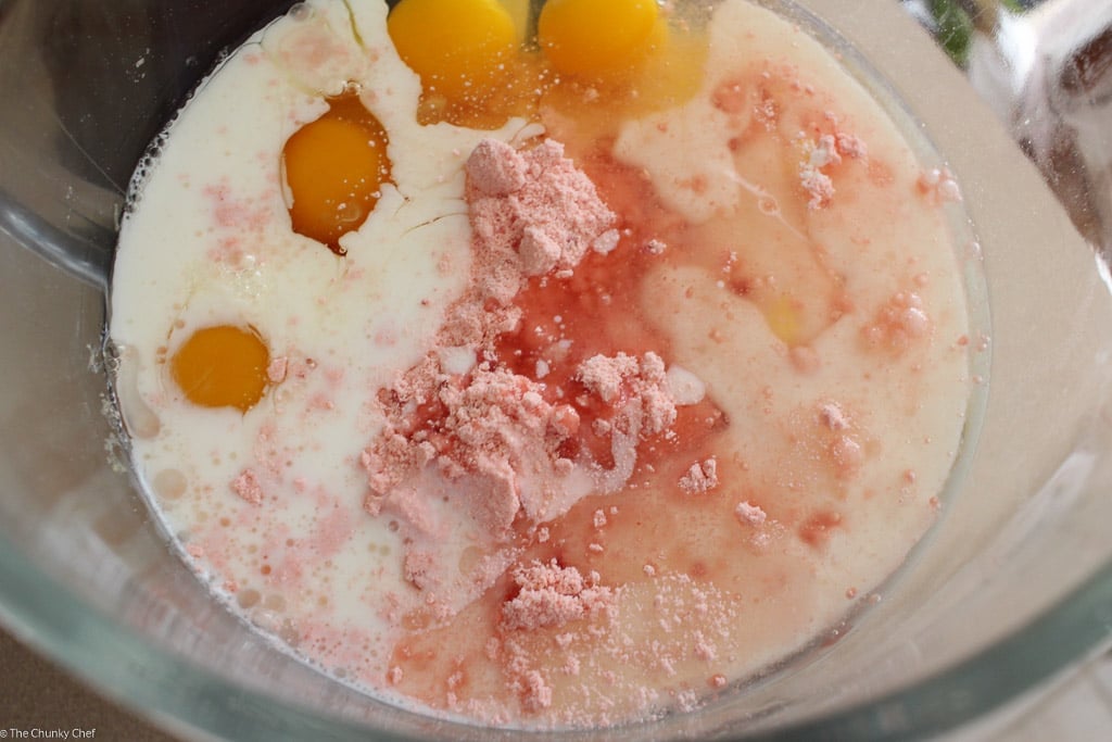 Start with a box of strawberry cake mix and follow the directions on the back of the box, with a couple of switch-outs.