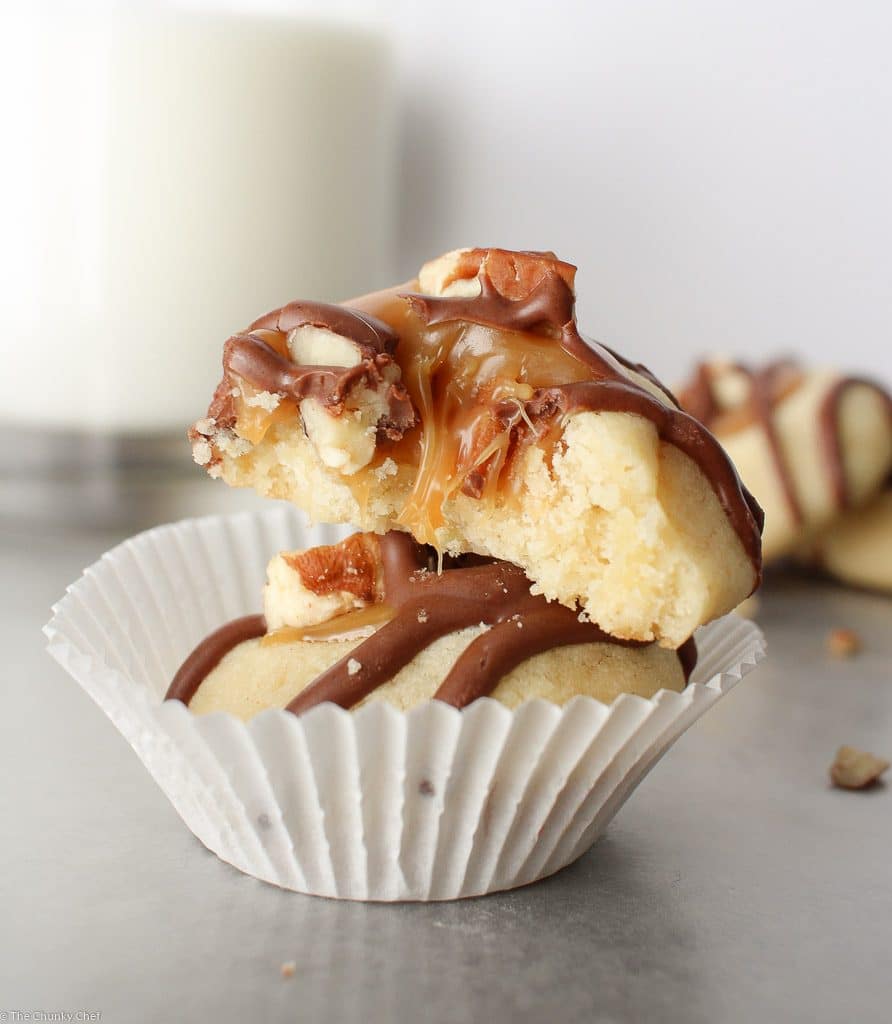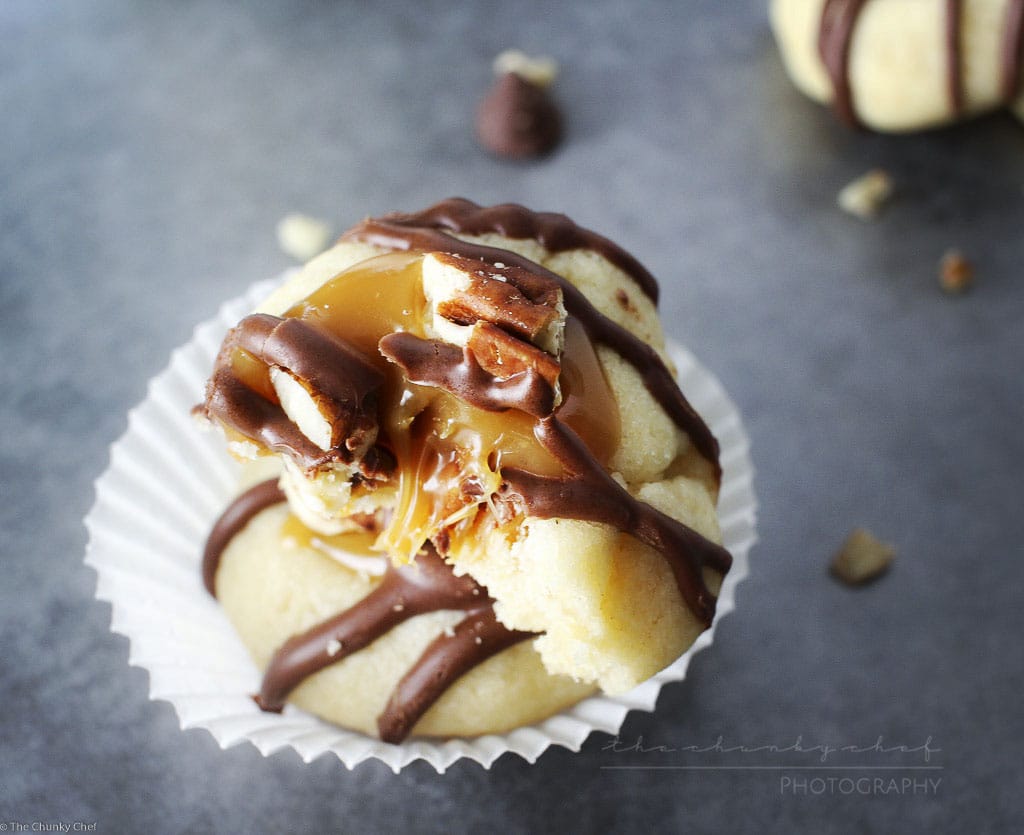 Thumbprint cookies are such a classic… this spin on them includes a gooey caramel center and drizzled melted chocolate. ย Tastes just like a Twix!