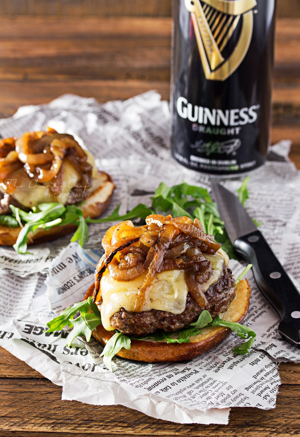 These blue cheese burgers are brushed with a homemade whiskey glazed, topped with Irish cheese, and smothered in Guinness caramelized onions!